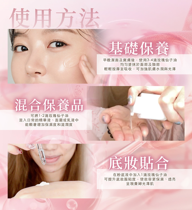 玫瑰精油相當保濕,對於肌膚的補濕同美白效果非常好,各類膚質皆適用,因此也成為保養品的新寵兒~