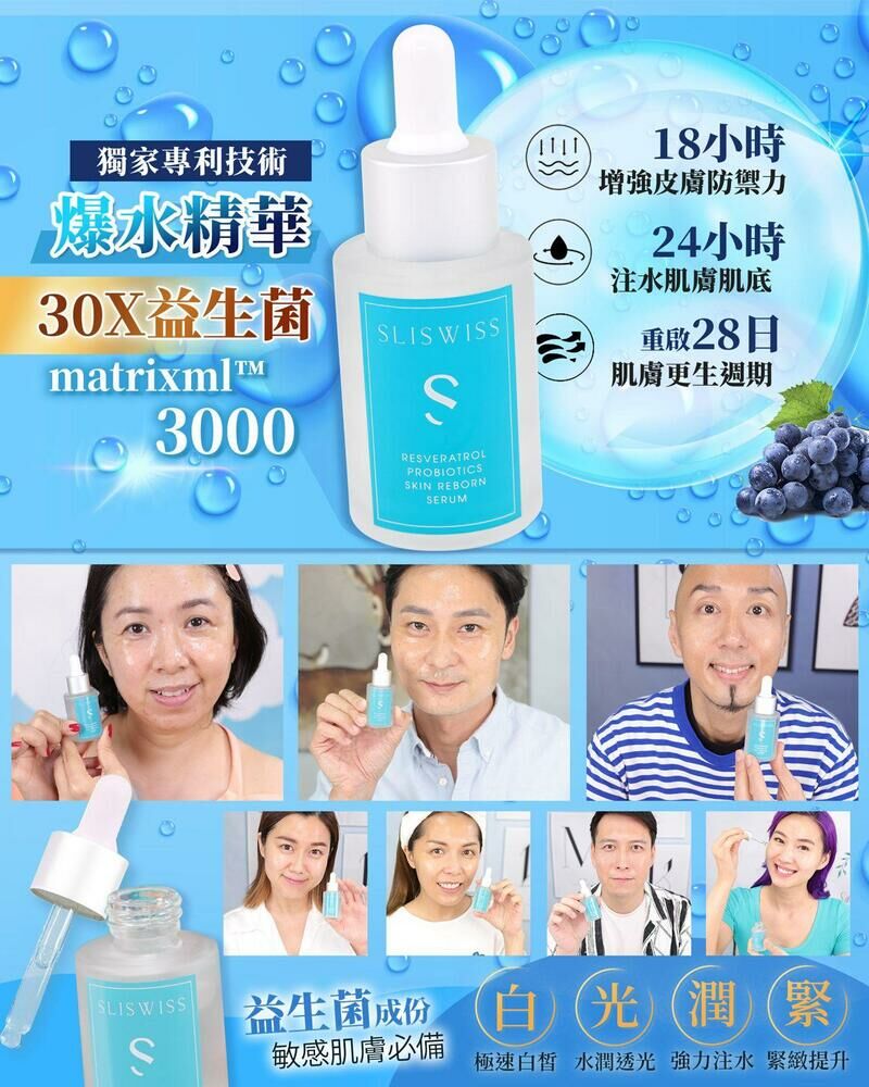 1. **全新Sliswiss白藜蘆醇爆水精華,結合白藜蘆醇與益生菌,全天候補水,修復肌膚屏障,打造健康水潤肌底。**