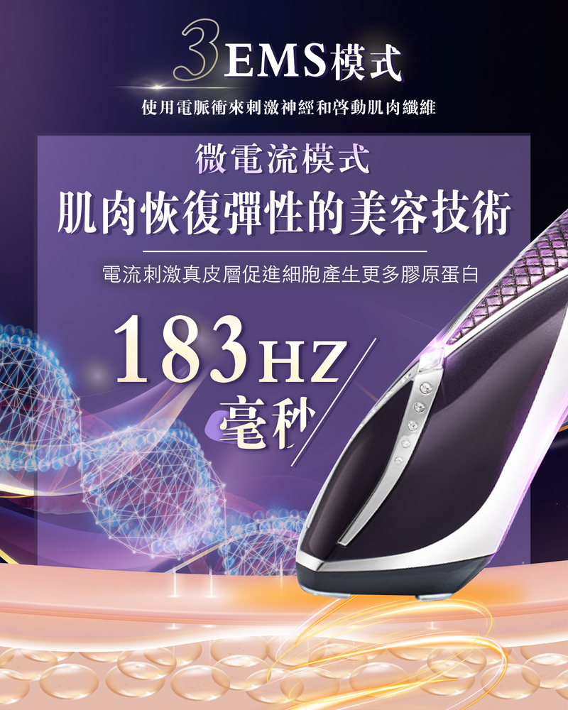 3. 【EMS微電流183HZ/毫秒】: 專業緊緻,模仿人體天然肌肉運動,反覆舒緩同收緊,深層鍛鍊鬆泡的面部肌膚,搭配精華緊緻塑顏,令肌膚緊俏豐潤,緊實輪廓線